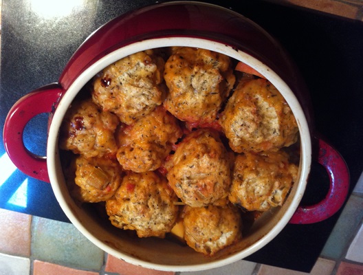 7) Transfer the vegetable mixture to the casserole dish and top with the dumplings.
