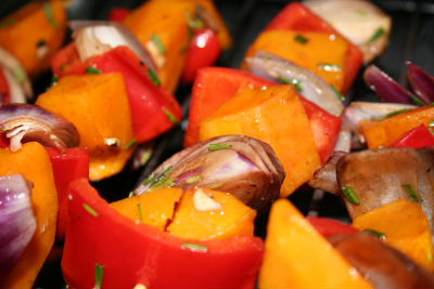 4) Arrange all the vegetables on the skewers and put them in a roasting tray.