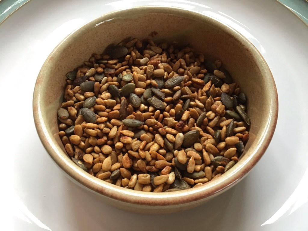 2) Put seeds in a dry frying pan over a low heat until browned. Stir them occasionally to prevent them from sticking and burning. Take the pan off the heat, stand back, and add a few dashes of soya sauce. Turn seeds with a spatula so that they are all coated, then tip into the grated carrot.