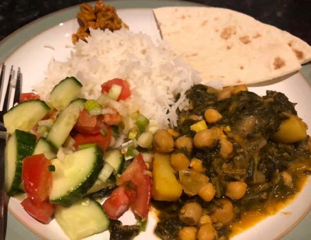 4) Cook for at least 5 more minutes until the potato is cooked and the spinach has wilted, then serve with rice or vegan naan.