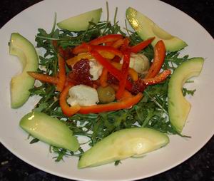 2) Divide rocket leaves between two plates and arrange pepper slices, sun-dried tomatoes, artichokes and olives on top.