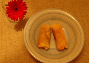 6) Continue until you have 3 or 4 spring rolls, then fry in the oil (test to see if small piece of spring roll pastry sizzles) until light golden brown and crispy. Drain, and lay on kitchen roll. Don’t stack them on top of each other or the undersides go soggy.