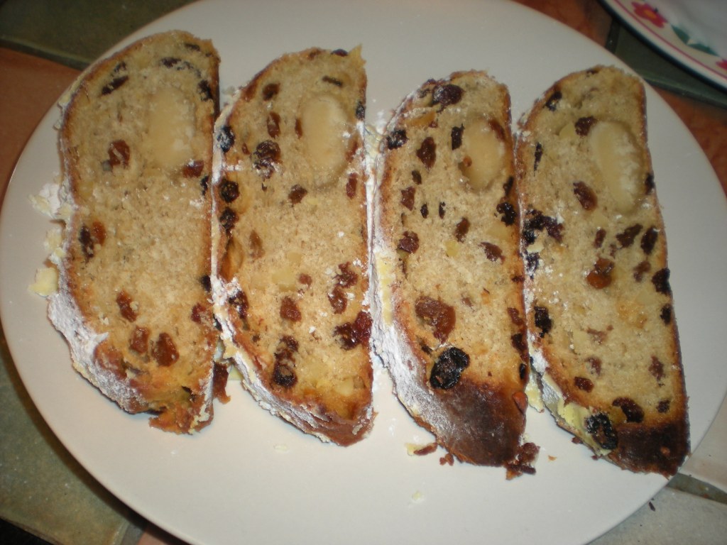 11. Brush the top of the hot/warm stollen loaves with extra melted margarine, and sprinkle over loads of icing sugar.